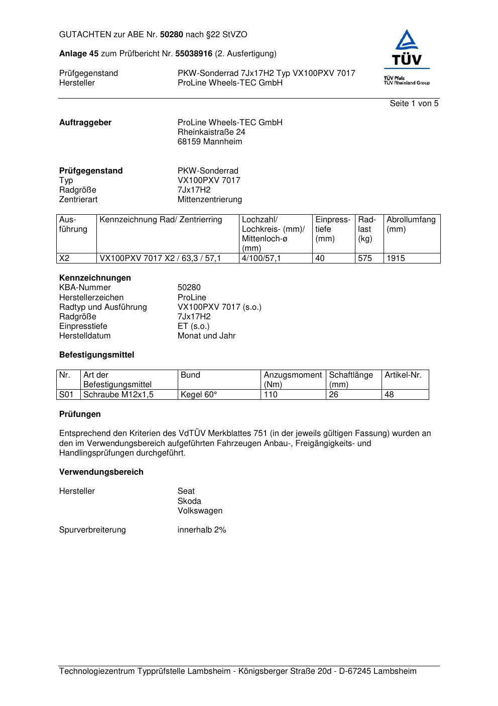 Dieses Gutachten (ABE) bezieht sich auf die Alufelge Proline VX100 in der Ausführung 7Jx17 ET 0, Mittenloch 0 mm (KBA 50280). Im PDF findest du typischerweise zulässige Reifengrößen, Auflagen/Anbauhinweise und – je nach Dokument – Hinweise zur Eintragung.