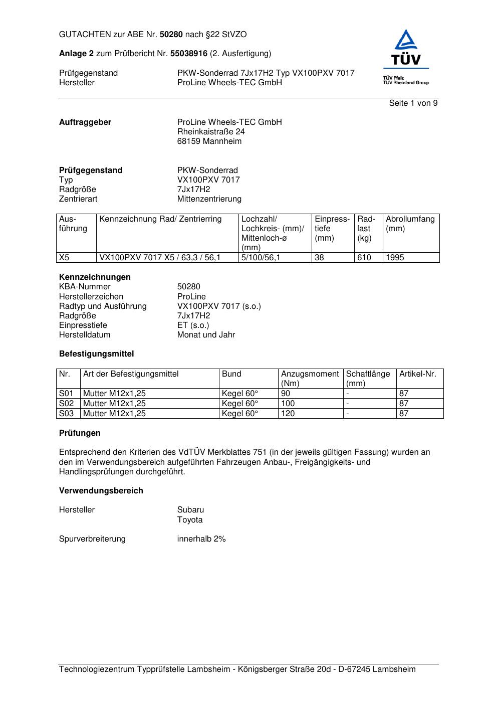 Dieses Gutachten (ABE) bezieht sich auf die Alufelge Proline VX100 in der Ausführung 7Jx17 ET 0, Mittenloch 0 mm (KBA 50280). Im PDF findest du typischerweise zulässige Reifengrößen, Auflagen/Anbauhinweise und – je nach Dokument – Hinweise zur Eintragung.