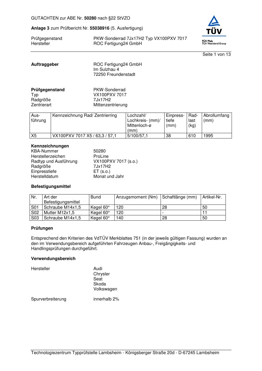 Dieses Gutachten (ABE) bezieht sich auf die Alufelge Proline VX100 in der Ausführung 7Jx17 ET 0, Mittenloch 0 mm (KBA 50280). Im PDF findest du typischerweise zulässige Reifengrößen, Auflagen/Anbauhinweise und – je nach Dokument – Hinweise zur Eintragung.
