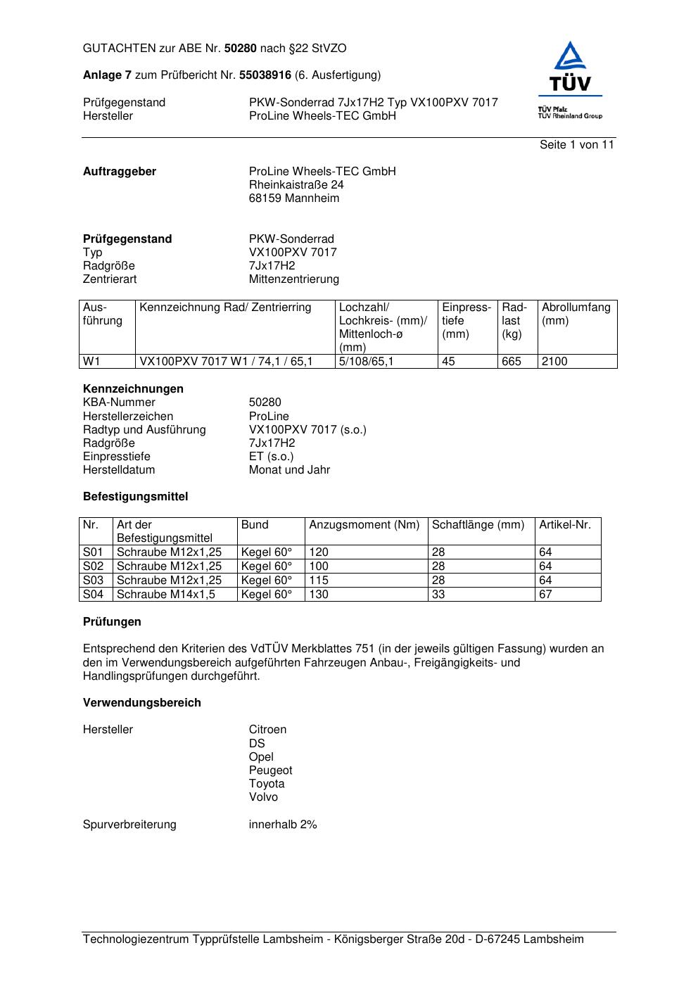 Dieses Gutachten (ABE) bezieht sich auf die Alufelge Proline VX100 in der Ausführung 7Jx17 ET 0, Mittenloch 0 mm (KBA 50280). Im PDF findest du typischerweise zulässige Reifengrößen, Auflagen/Anbauhinweise und – je nach Dokument – Hinweise zur Eintragung.