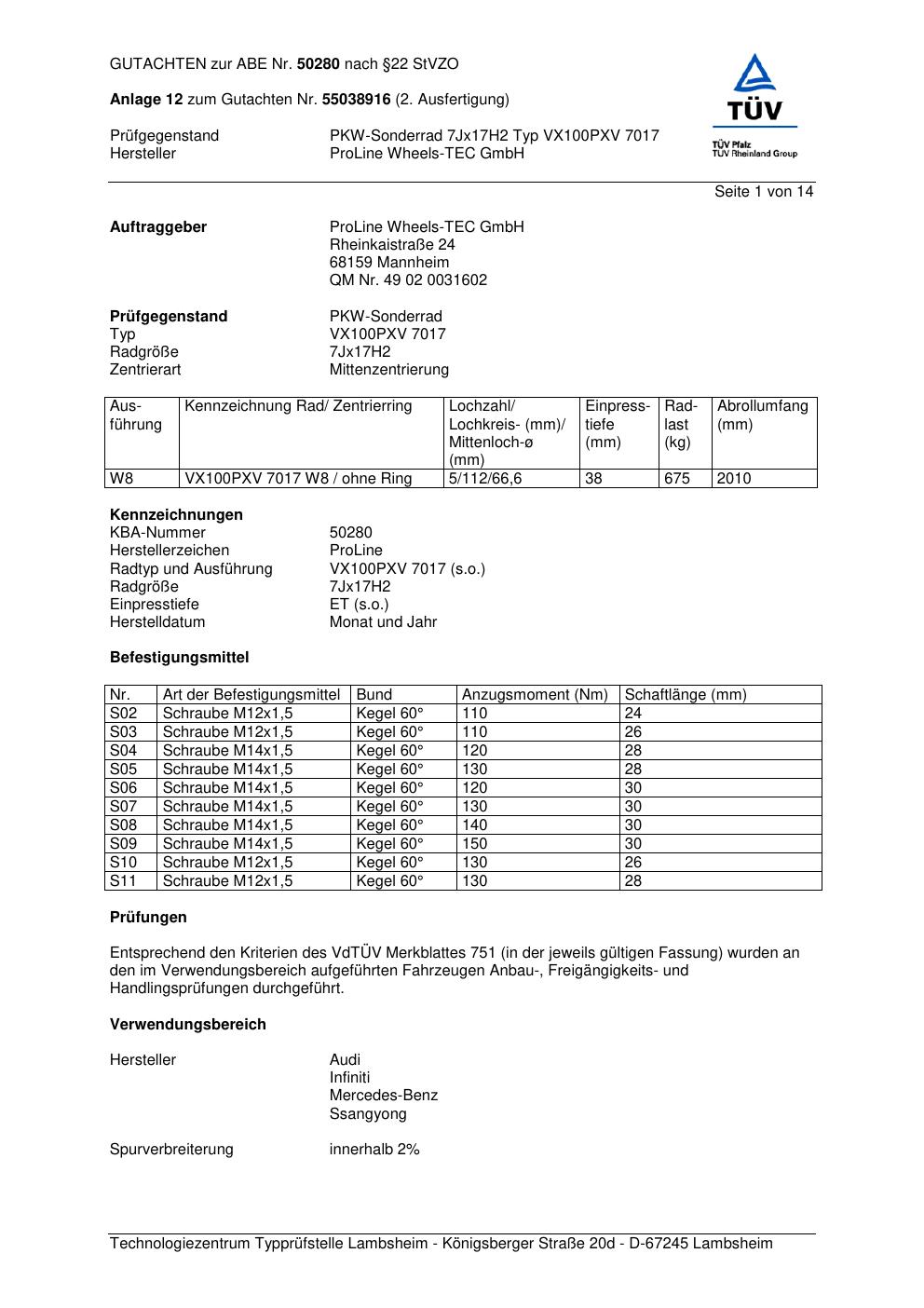 Dieses Gutachten (ABE) bezieht sich auf die Alufelge Proline VX100 in der Ausführung 7Jx17 ET 0, Mittenloch 0 mm (KBA 50280). Im PDF findest du typischerweise zulässige Reifengrößen, Auflagen/Anbauhinweise und – je nach Dokument – Hinweise zur Eintragung.