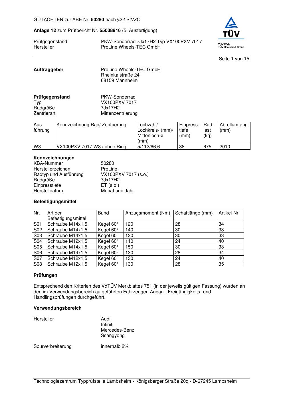 Felgengutachten / ABE für Alufelgen Proline VX100 (7Jx17 ET 0, Mittenloch 0 mm) mit KBA 50280 (Zertifikatsnummer KBA 50280). Hier kostenlos als PDF herunterladen. Der Download-Link ist 24 Stunden gültig und kann bis zu zwei Mal verwendet werden.
