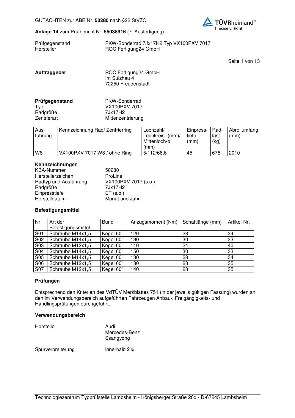 Dieses Gutachten (ABE) bezieht sich auf die Alufelge Proline VX100 in der Ausführung 7Jx17 ET 0, Mittenloch 0 mm (KBA 50280). Im PDF findest du typischerweise zulässige Reifengrößen, Auflagen/Anbauhinweise und – je nach Dokument – Hinweise zur Eintragung.