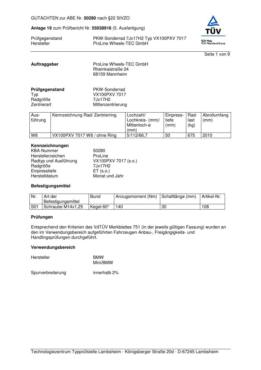 Dieses Gutachten (ABE) bezieht sich auf die Alufelge Proline VX100 in der Ausführung 7Jx17 ET 0, Mittenloch 0 mm (KBA 50280). Im PDF findest du typischerweise zulässige Reifengrößen, Auflagen/Anbauhinweise und – je nach Dokument – Hinweise zur Eintragung.