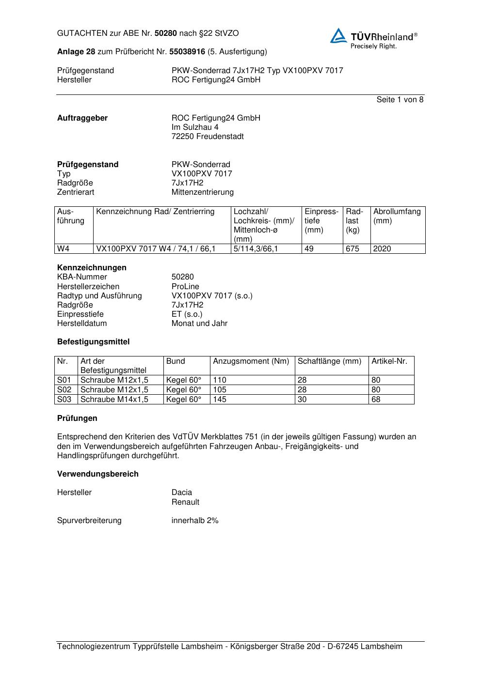 Dieses Gutachten (ABE) bezieht sich auf die Alufelge Proline VX100 in der Ausführung 7Jx17 ET 0, Mittenloch 0 mm (KBA 50280). Im PDF findest du typischerweise zulässige Reifengrößen, Auflagen/Anbauhinweise und – je nach Dokument – Hinweise zur Eintragung.