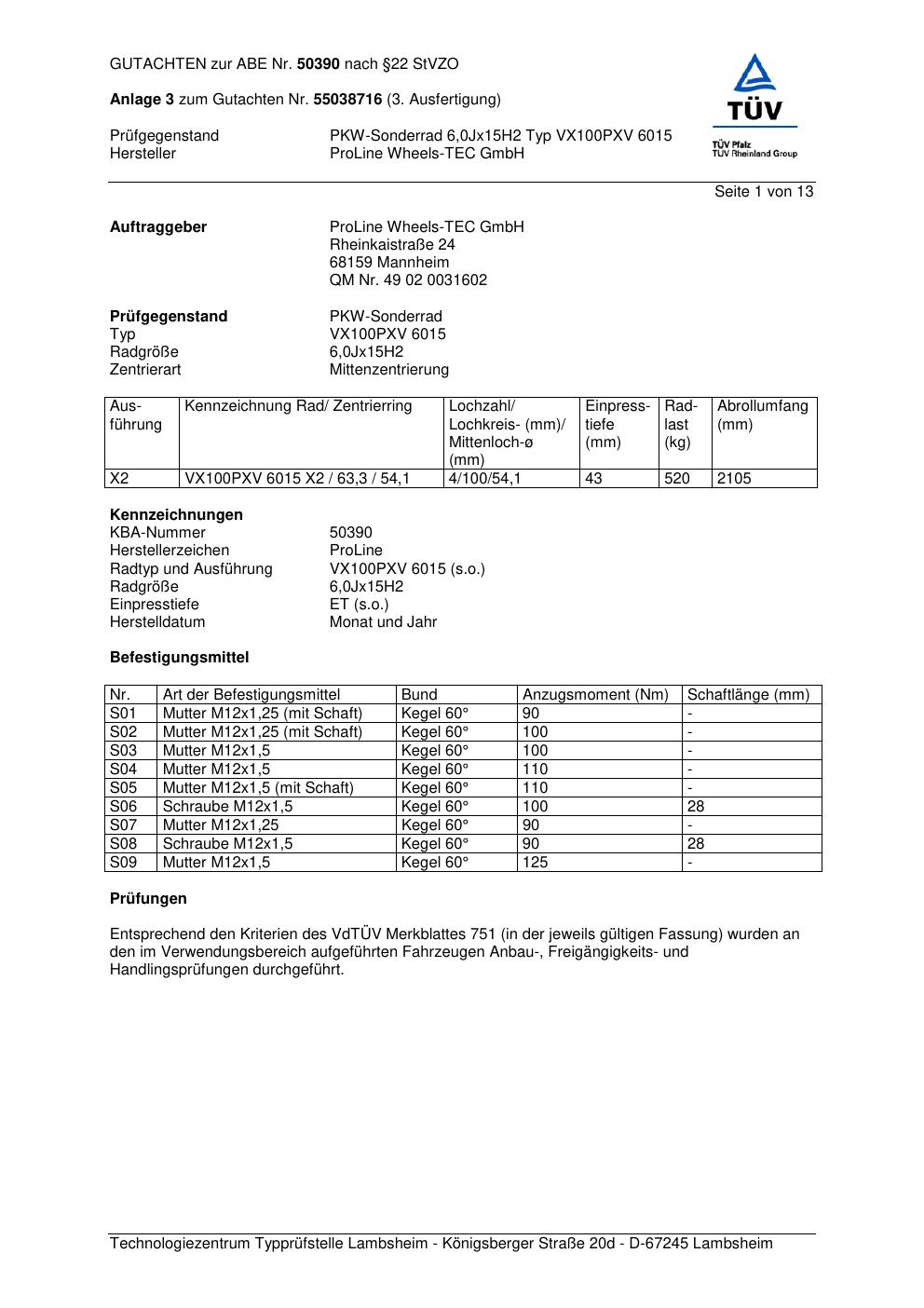 Dieses Gutachten (ABE) bezieht sich auf die Alufelge Proline VX100 in der Ausführung 6Jx15 ET 0, Mittenloch 0 mm (KBA 50390). Im PDF findest du typischerweise zulässige Reifengrößen, Auflagen/Anbauhinweise und – je nach Dokument – Hinweise zur Eintragung.