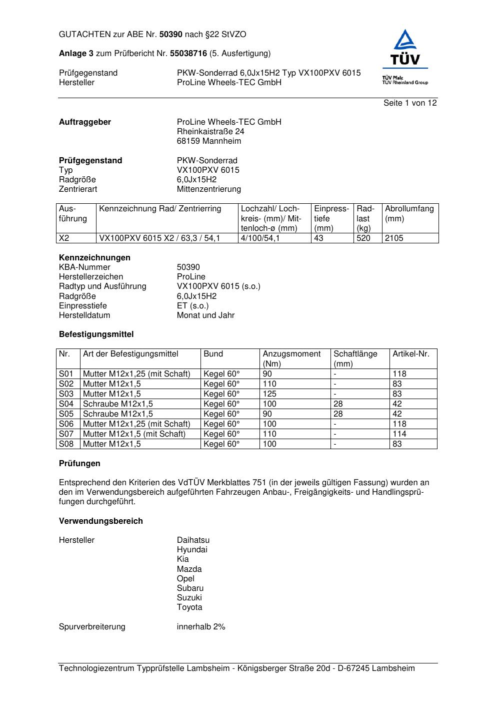 Dieses Gutachten (ABE) bezieht sich auf die Alufelge Proline VX100 in der Ausführung 6Jx15 ET 0, Mittenloch 0 mm (KBA 50390). Im PDF findest du typischerweise zulässige Reifengrößen, Auflagen/Anbauhinweise und – je nach Dokument – Hinweise zur Eintragung.