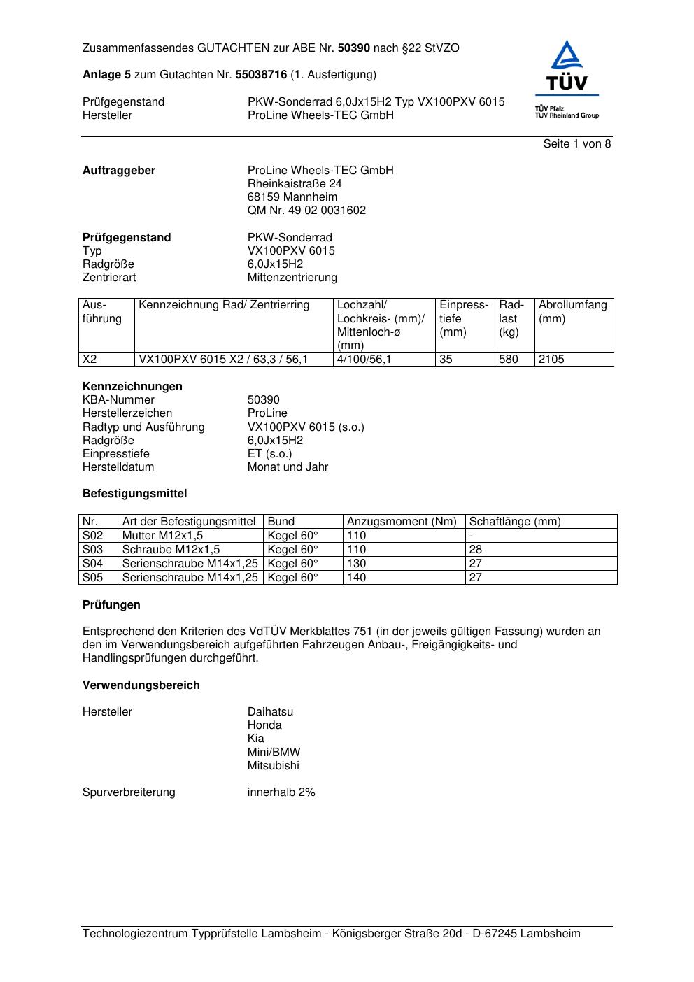 Dieses Gutachten (ABE) bezieht sich auf die Alufelge Proline VX100 in der Ausführung 6Jx15 ET 0, Mittenloch 0 mm (KBA 50390). Im PDF findest du typischerweise zulässige Reifengrößen, Auflagen/Anbauhinweise und – je nach Dokument – Hinweise zur Eintragung.