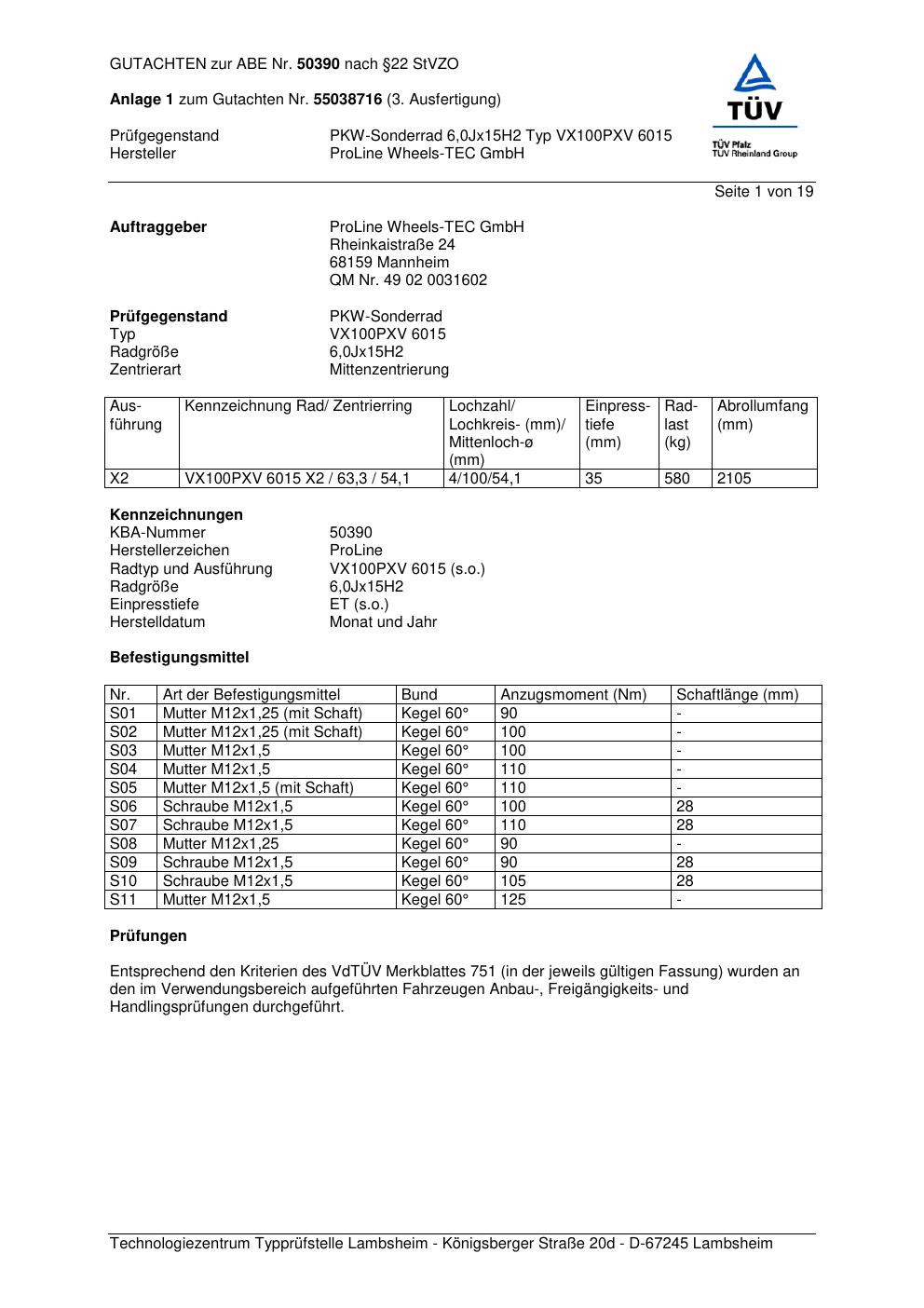 Dieses Gutachten (ABE) bezieht sich auf die Alufelge Proline VX100 in der Ausführung 6Jx15 ET 0, Mittenloch 0 mm (KBA 50390). Im PDF findest du typischerweise zulässige Reifengrößen, Auflagen/Anbauhinweise und – je nach Dokument – Hinweise zur Eintragung.