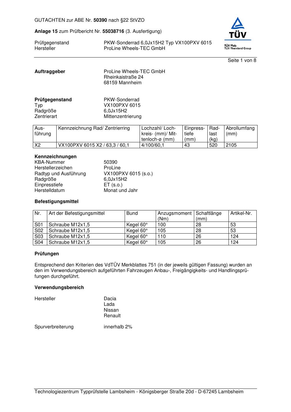 Felgengutachten / ABE für Alufelgen Proline VX100 (6Jx15 ET 0, Mittenloch 0 mm) mit KBA 50390 (Zertifikatsnummer KBA 50390). Hier kostenlos als PDF herunterladen. Der Download-Link ist 24 Stunden gültig und kann bis zu zwei Mal verwendet werden.