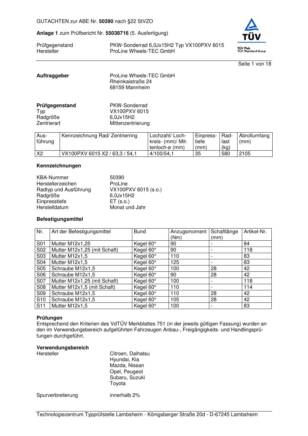 Dieses Gutachten (ABE) bezieht sich auf die Alufelge Proline VX100 in der Ausführung 6Jx15 ET 0, Mittenloch 0 mm (KBA 50390). Im PDF findest du typischerweise zulässige Reifengrößen, Auflagen/Anbauhinweise und – je nach Dokument – Hinweise zur Eintragung.