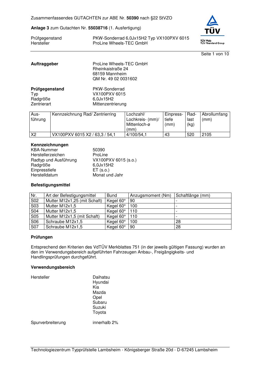 Dieses Gutachten (ABE) bezieht sich auf die Alufelge Proline VX100 in der Ausführung 6Jx15 ET 0, Mittenloch 0 mm (KBA 50390). Im PDF findest du typischerweise zulässige Reifengrößen, Auflagen/Anbauhinweise und – je nach Dokument – Hinweise zur Eintragung.