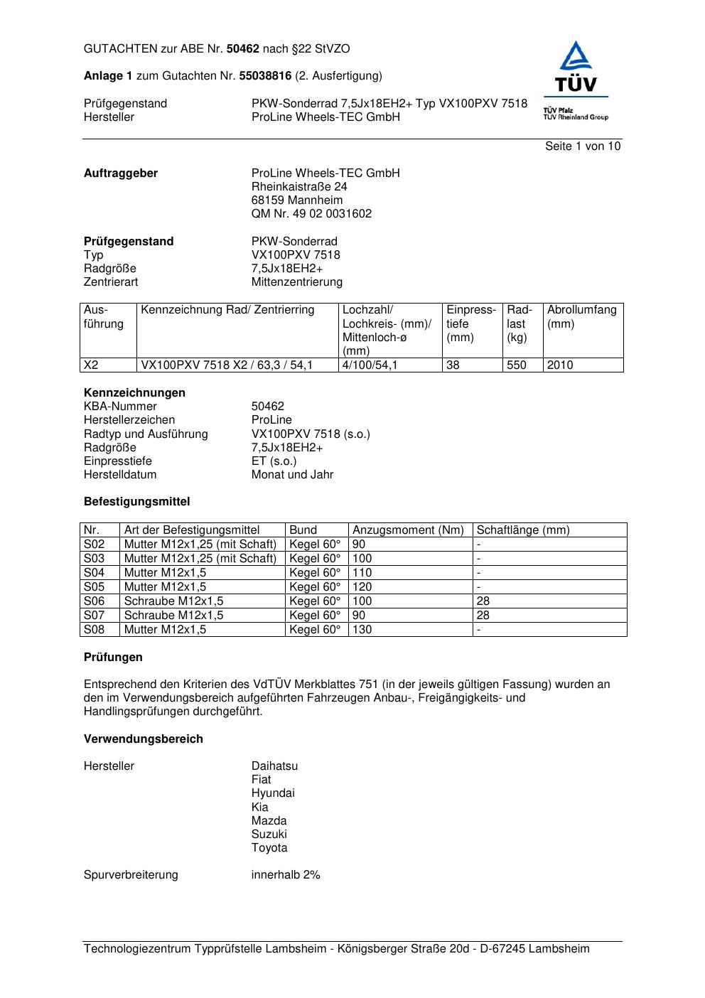 Dieses Gutachten (ABE) bezieht sich auf die Alufelge Proline VX100 in der Ausführung 7.5Jx18 ET 0, Mittenloch 0 mm (KBA 50462). Im PDF findest du typischerweise zulässige Reifengrößen, Auflagen/Anbauhinweise und – je nach Dokument – Hinweise zur Eintragung.