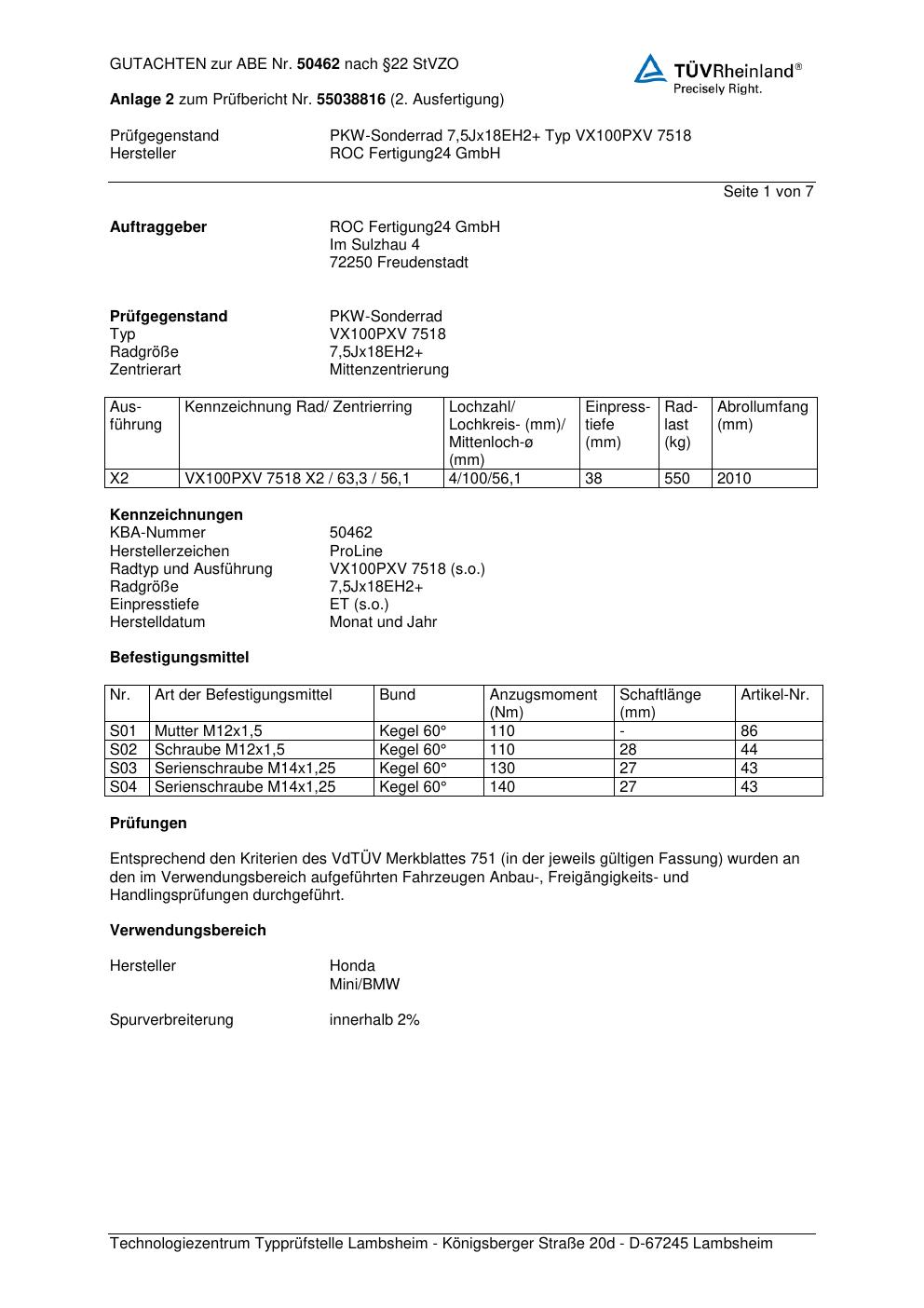 Dieses Gutachten (ABE) bezieht sich auf die Alufelge Proline VX100 in der Ausführung 7.5Jx18 ET 0, Mittenloch 0 mm (KBA 50462). Im PDF findest du typischerweise zulässige Reifengrößen, Auflagen/Anbauhinweise und – je nach Dokument – Hinweise zur Eintragung.