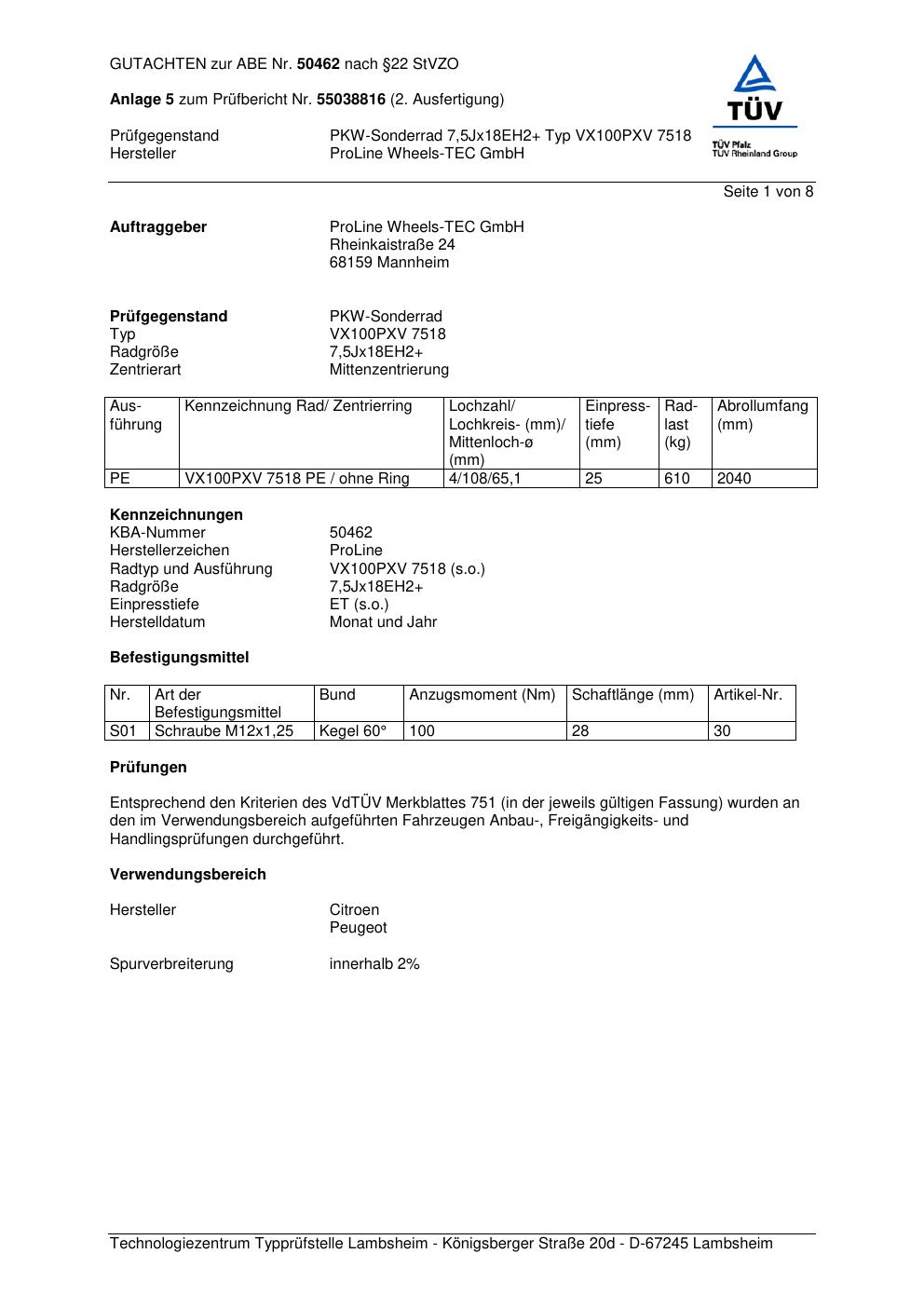 Dieses Gutachten (ABE) bezieht sich auf die Alufelge Proline VX100 in der Ausführung 7.5Jx18 ET 0, Mittenloch 0 mm (KBA 50462). Im PDF findest du typischerweise zulässige Reifengrößen, Auflagen/Anbauhinweise und – je nach Dokument – Hinweise zur Eintragung.
