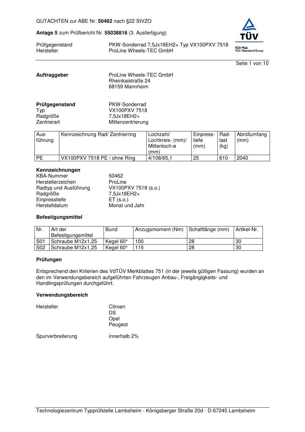 Dieses Gutachten (ABE) bezieht sich auf die Alufelge Proline VX100 in der Ausführung 7.5Jx18 ET 0, Mittenloch 0 mm (KBA 50462). Im PDF findest du typischerweise zulässige Reifengrößen, Auflagen/Anbauhinweise und – je nach Dokument – Hinweise zur Eintragung.