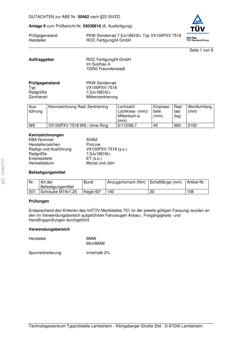 Dieses Gutachten (ABE) bezieht sich auf die Alufelge Proline VX100 in der Ausführung 7.5Jx18 ET 0, Mittenloch 0 mm (KBA 50462). Im PDF findest du typischerweise zulässige Reifengrößen, Auflagen/Anbauhinweise und – je nach Dokument – Hinweise zur Eintragung.
