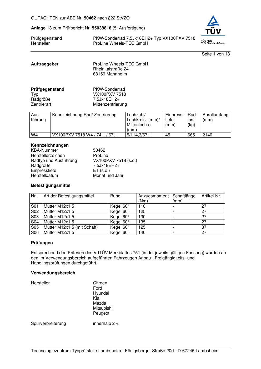 Dieses Gutachten (ABE) bezieht sich auf die Alufelge Proline VX100 in der Ausführung 7.5Jx18 ET 0, Mittenloch 0 mm (KBA 50462). Im PDF findest du typischerweise zulässige Reifengrößen, Auflagen/Anbauhinweise und – je nach Dokument – Hinweise zur Eintragung.