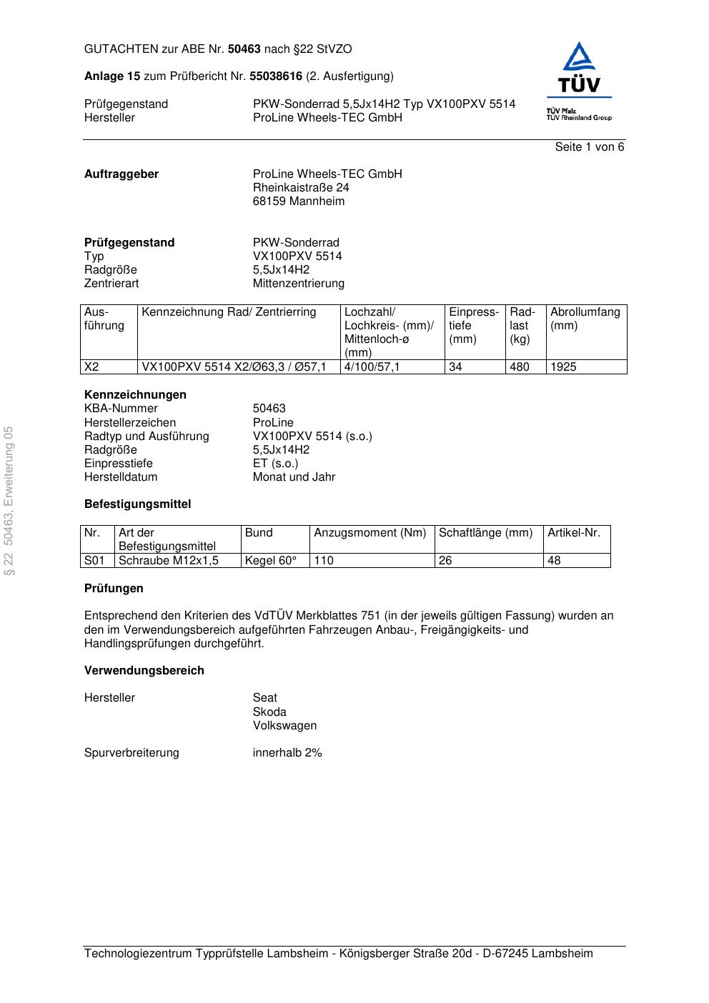 Dieses Gutachten (ABE) bezieht sich auf die Alufelge Proline VX100 in der Ausführung 5.5Jx14 ET 0, Mittenloch 0 mm (KBA 50463). Im PDF findest du typischerweise zulässige Reifengrößen, Auflagen/Anbauhinweise und – je nach Dokument – Hinweise zur Eintragung.