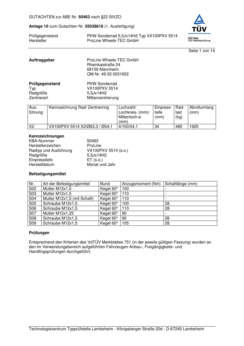 Dieses Gutachten (ABE) bezieht sich auf die Alufelge Proline VX100 in der Ausführung 5.5Jx14 ET 0, Mittenloch 0 mm (KBA 50463). Im PDF findest du typischerweise zulässige Reifengrößen, Auflagen/Anbauhinweise und – je nach Dokument – Hinweise zur Eintragung.