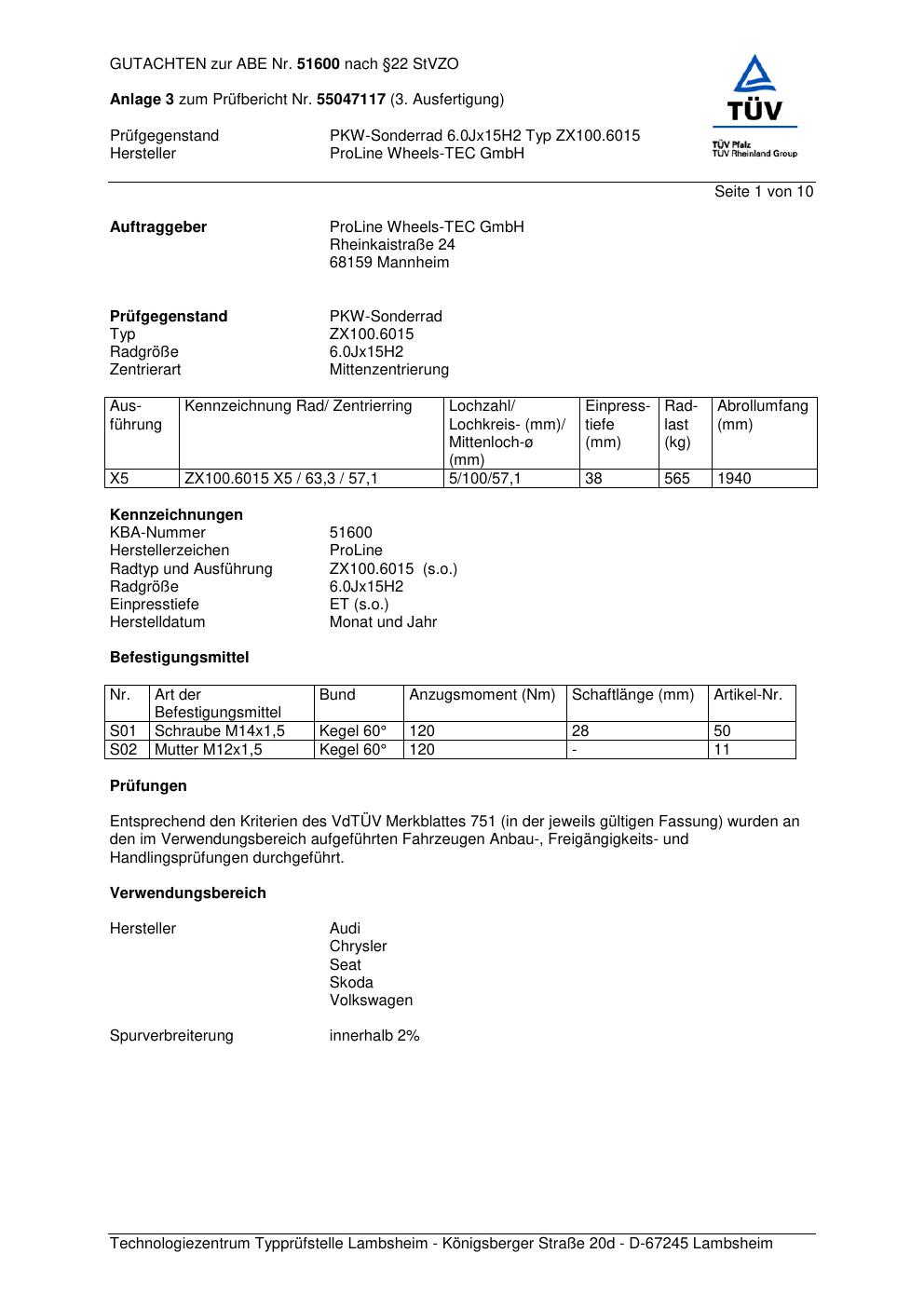 Dieses Gutachten (ABE) bezieht sich auf die Alufelge Proline ZX100.6015 in der Ausführung 6Jx15 ET 0, Mittenloch 0 mm (KBA 51600). Im PDF findest du typischerweise zulässige Reifengrößen, Auflagen/Anbauhinweise und – je nach Dokument – Hinweise zur Eintragung.
