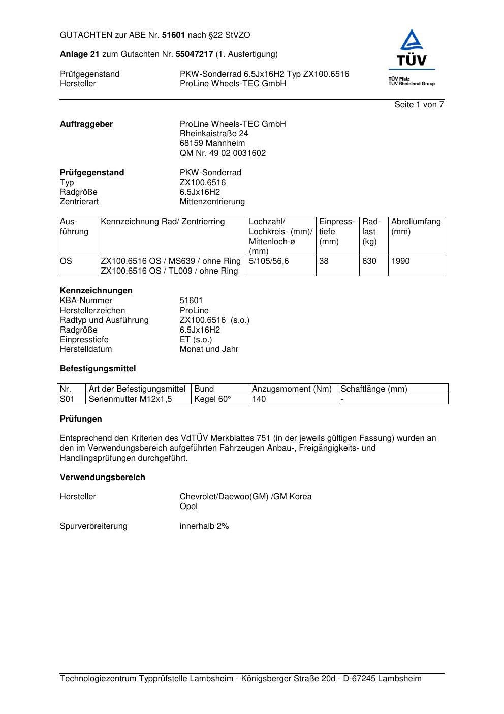 Dieses Gutachten (ABE) bezieht sich auf die Alufelge Proline ZX100.6516 in der Ausführung 6.5Jx16 ET 0, Mittenloch 0 mm (KBA 51601). Im PDF findest du typischerweise zulässige Reifengrößen, Auflagen/Anbauhinweise und – je nach Dokument – Hinweise zur Eintragung.