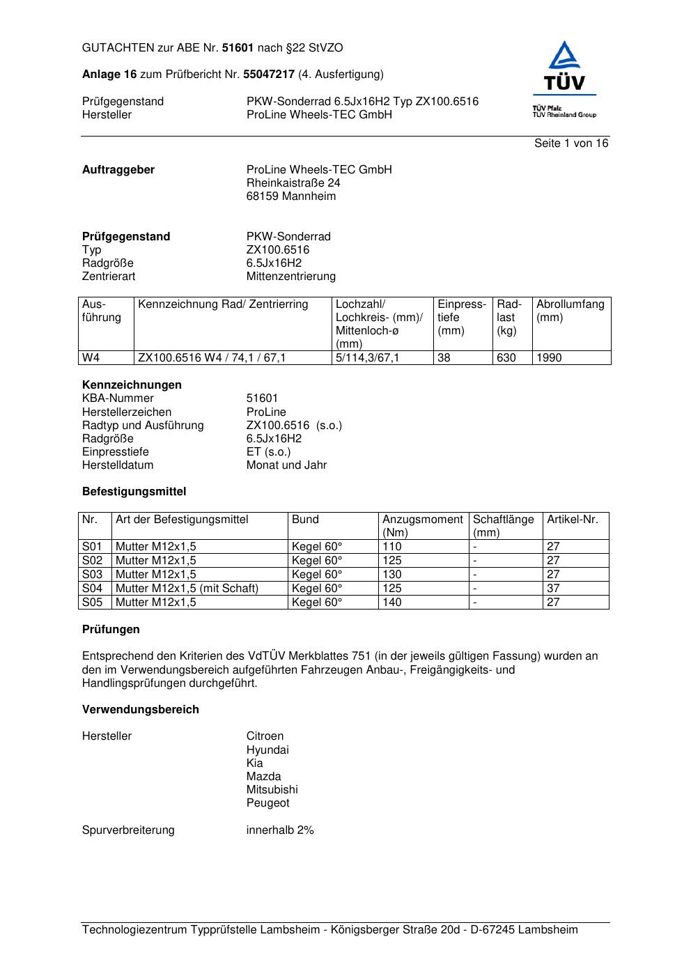 Dieses Gutachten (ABE) bezieht sich auf die Alufelge Proline ZX100.6516 in der Ausführung 6.5Jx16 ET 0, Mittenloch 0 mm (KBA 51601). Im PDF findest du typischerweise zulässige Reifengrößen, Auflagen/Anbauhinweise und – je nach Dokument – Hinweise zur Eintragung.