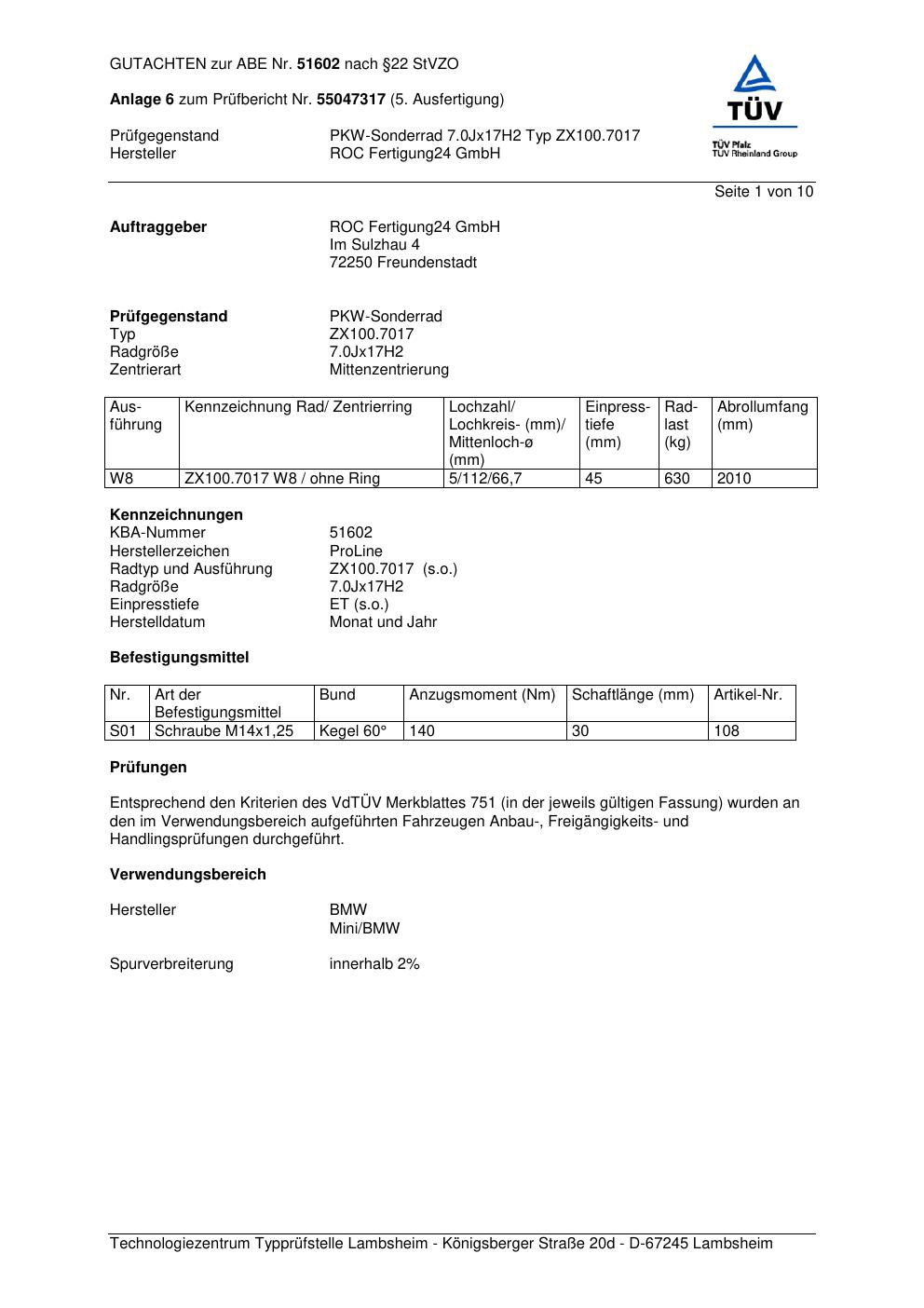 Dieses Gutachten (ABE) bezieht sich auf die Alufelge Proline ZX100.7017 in der Ausführung 7Jx17 ET 0, Mittenloch 0 mm (KBA 51602). Im PDF findest du typischerweise zulässige Reifengrößen, Auflagen/Anbauhinweise und – je nach Dokument – Hinweise zur Eintragung.