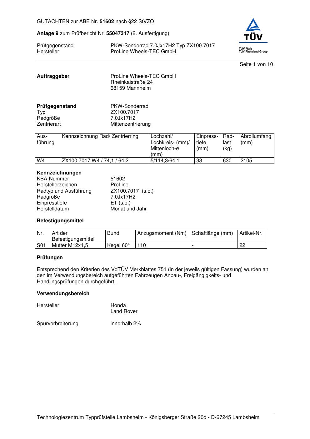 Dieses Gutachten (ABE) bezieht sich auf die Alufelge Proline ZX100.7017 in der Ausführung 7Jx17 ET 0, Mittenloch 0 mm (KBA 51602). Im PDF findest du typischerweise zulässige Reifengrößen, Auflagen/Anbauhinweise und – je nach Dokument – Hinweise zur Eintragung.