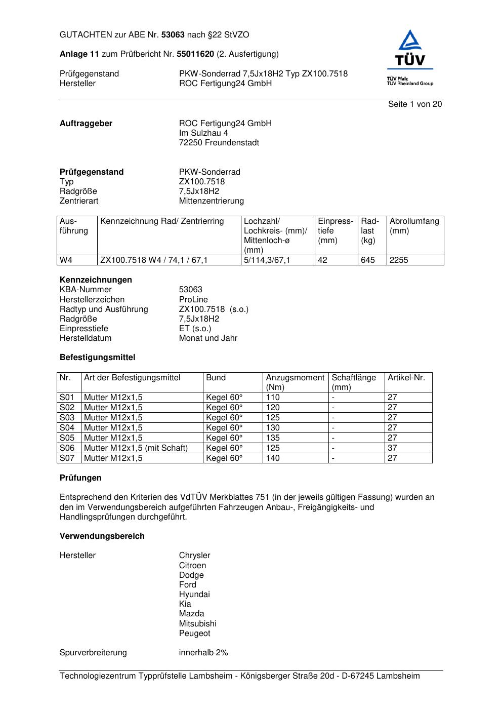Dieses Gutachten (ABE) bezieht sich auf die Alufelge Proline ZX100.7518 in der Ausführung 7.5Jx18 ET 0, Mittenloch 0 mm (KBA 53063). Im PDF findest du typischerweise zulässige Reifengrößen, Auflagen/Anbauhinweise und – je nach Dokument – Hinweise zur Eintragung.