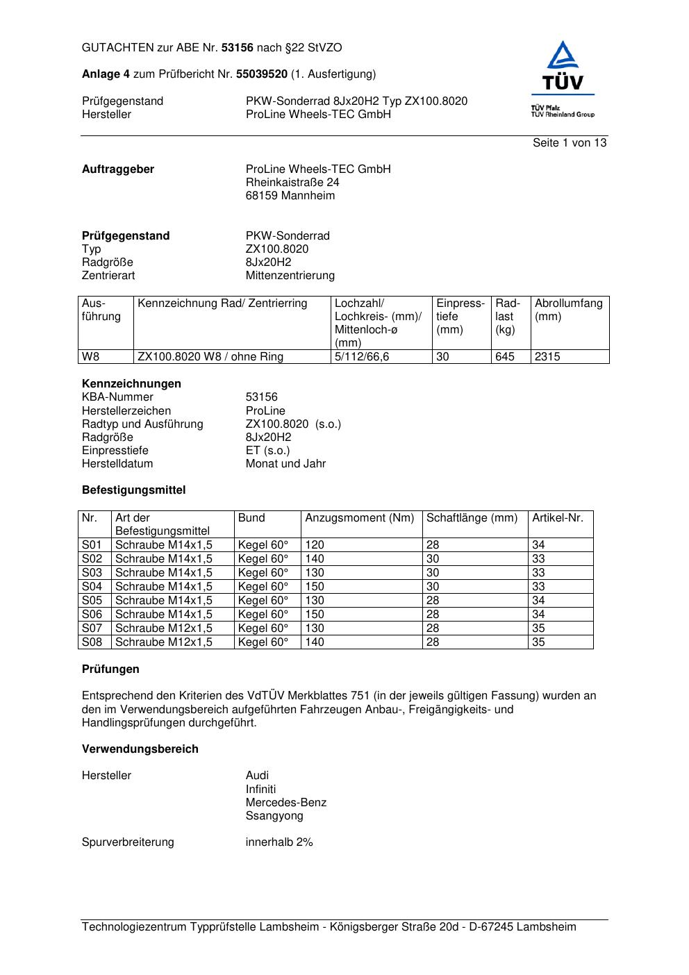 Felgengutachten / ABE für Alufelgen Proline ZX100.8020 (8Jx2 ET 0, Mittenloch 0 mm) mit KBA 53156 (Zertifikatsnummer KBA 53156). Hier kostenlos als PDF herunterladen. Der Download-Link ist 24 Stunden gültig und kann bis zu zwei Mal verwendet werden.