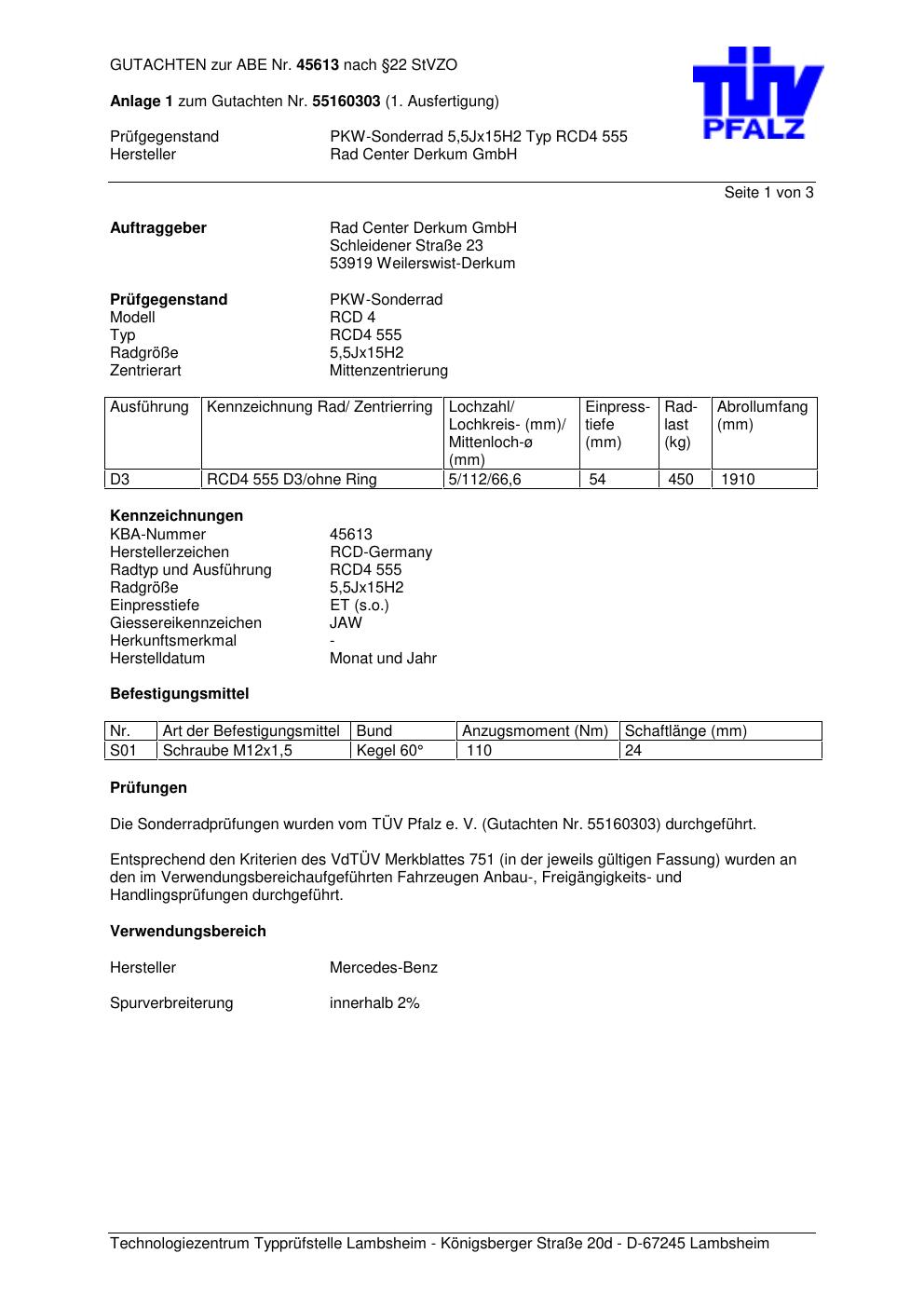 Dieses Gutachten (abe) bezieht sich auf die Alufelge Rad Center Derkum GmbH RCD4 555 in der Ausführung ET 0, Mittenloch 0 mm (KBA 45613). Im PDF findest du typischerweise zulässige Reifengrößen, Auflagen/Anbauhinweise und – je nach Dokument – Hinweise zur Eintragung.