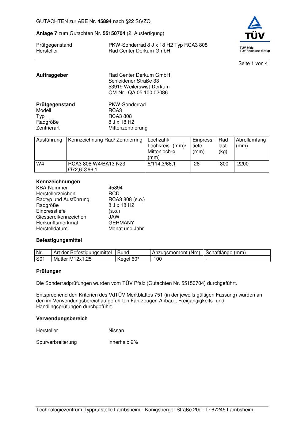 Dieses Gutachten (abe) bezieht sich auf die Alufelge Rad Center Derkum GmbH RCA3 808 in der Ausführung ET 0, Mittenloch 0 mm (KBA 45894). Im PDF findest du typischerweise zulässige Reifengrößen, Auflagen/Anbauhinweise und – je nach Dokument – Hinweise zur Eintragung.