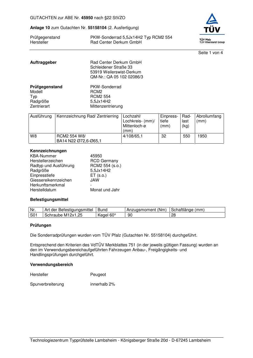 Dieses Gutachten (abe) bezieht sich auf die Alufelge Rad Center Derkum GmbH RCM2 554 in der Ausführung ET 0, Mittenloch 0 mm (KBA 45950). Im PDF findest du typischerweise zulässige Reifengrößen, Auflagen/Anbauhinweise und – je nach Dokument – Hinweise zur Eintragung.