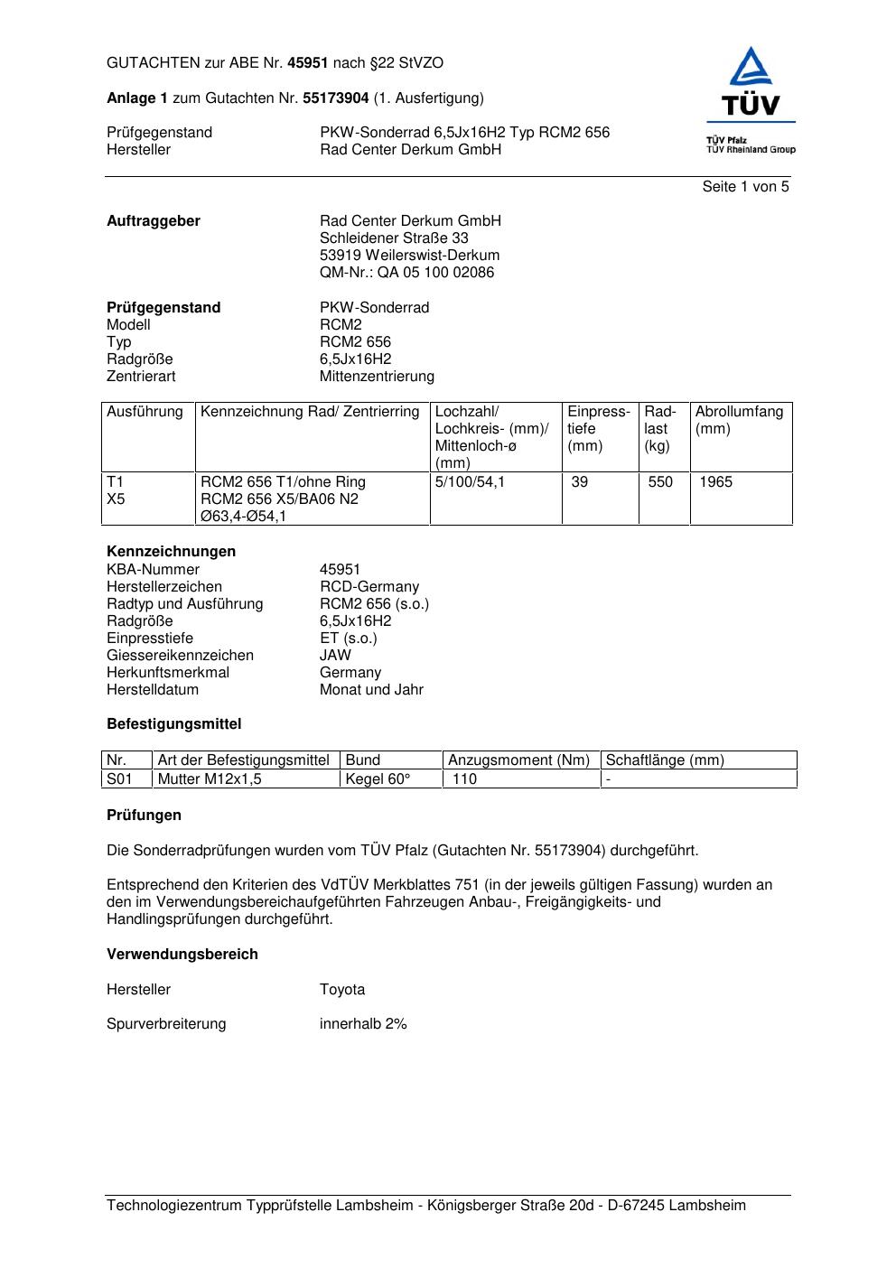 Dieses Gutachten (abe) bezieht sich auf die Alufelge Rad Center Derkum GmbH RCM2 656 in der Ausführung ET 0, Mittenloch 0 mm (KBA 45951). Im PDF findest du typischerweise zulässige Reifengrößen, Auflagen/Anbauhinweise und – je nach Dokument – Hinweise zur Eintragung.
