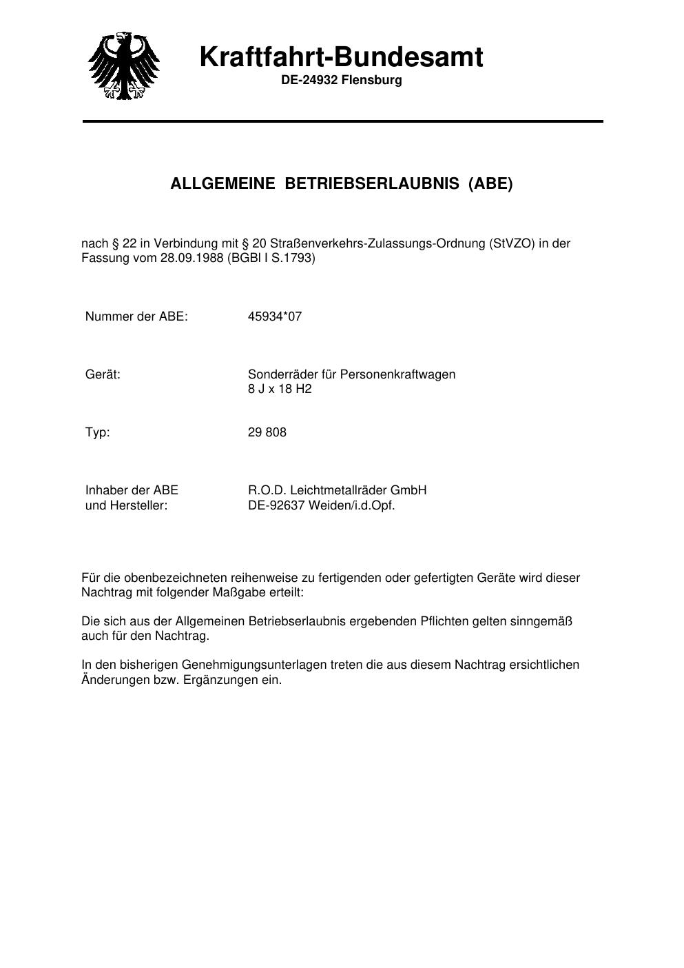 Dieses Gutachten (ABE) bezieht sich auf die Alufelge Rondell 0029 in der Ausführung 8Jx18 ET 0, Mittenloch 0 mm (KBA 45934). Im PDF findest du typischerweise zulässige Reifengrößen, Auflagen/Anbauhinweise und – je nach Dokument – Hinweise zur Eintragung.