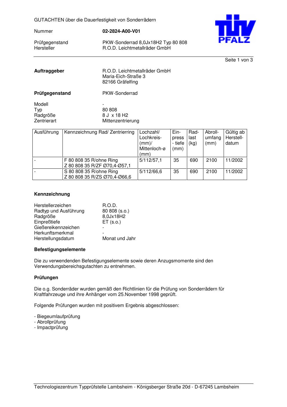 Felgengutachten / FESTIGKEITSGUTACHTEN für Alufelgen Rondell 0080 (8Jx18 ET 0) (Zertifikatsnummer 80 808). Hier kostenlos als PDF herunterladen. Der Download-Link ist 24 Stunden gültig und kann bis zu zwei Mal verwendet werden.