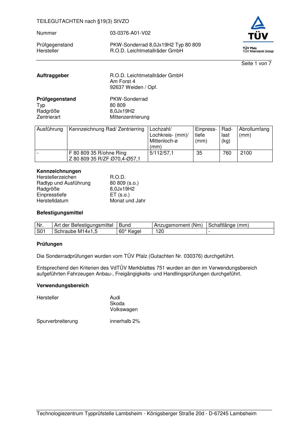 Felgengutachten / TEILEGUTACHTEN für Alufelgen Rondell 0080 (7.5Jx17 ET 0) (Zertifikatsnummer 80 809). Hier kostenlos als PDF herunterladen. Der Download-Link ist 24 Stunden gültig und kann bis zu zwei Mal verwendet werden.