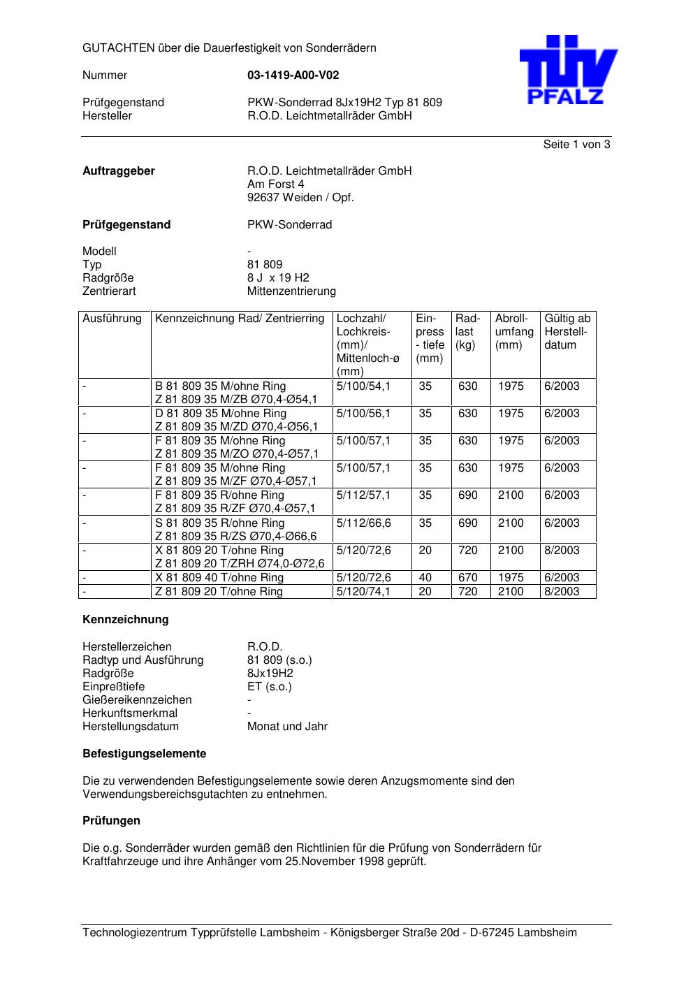 Felgengutachten / FESTIGKEITSGUTACHTEN für Alufelgen Rondell 0081 (8Jx19 ET 0) (Zertifikatsnummer 81 809). Hier kostenlos als PDF herunterladen. Der Download-Link ist 24 Stunden gültig und kann bis zu zwei Mal verwendet werden.