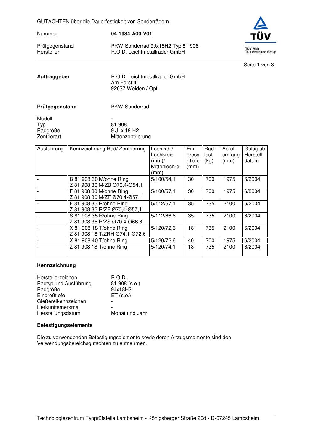 Felgengutachten / FESTIGKEITSGUTACHTEN für Alufelgen Rondell 0081 (9Jx18 ET 0) (Zertifikatsnummer 81 908). Hier kostenlos als PDF herunterladen. Der Download-Link ist 24 Stunden gültig und kann bis zu zwei Mal verwendet werden.