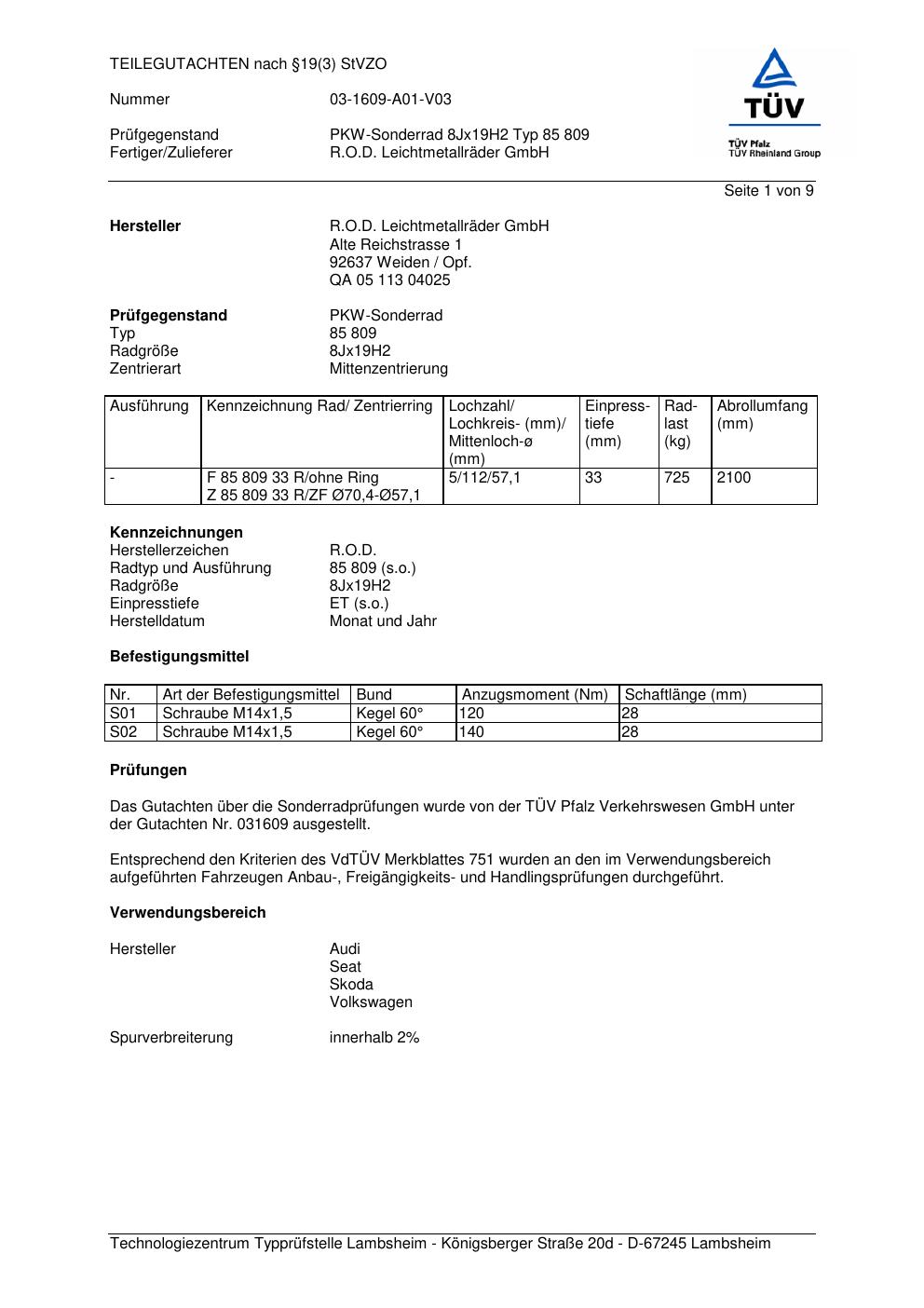 Felgengutachten / FESTIGKEITSGUTACHTEN für Alufelgen Rondell 0085 (8Jx19 ET 0) (Zertifikatsnummer 85 809). Hier kostenlos als PDF herunterladen. Der Download-Link ist 24 Stunden gültig und kann bis zu zwei Mal verwendet werden.