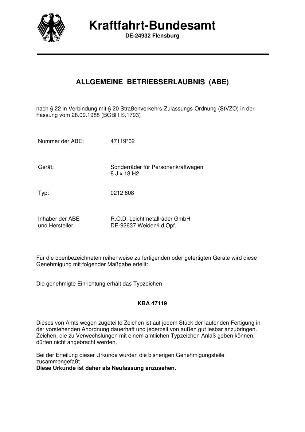 Dieses Gutachten (ABE) bezieht sich auf die Alufelge Rondell 0212 in der Ausführung 8Jx18 ET 0, Mittenloch 0 mm (KBA 47119). Im PDF findest du typischerweise zulässige Reifengrößen, Auflagen/Anbauhinweise und – je nach Dokument – Hinweise zur Eintragung.