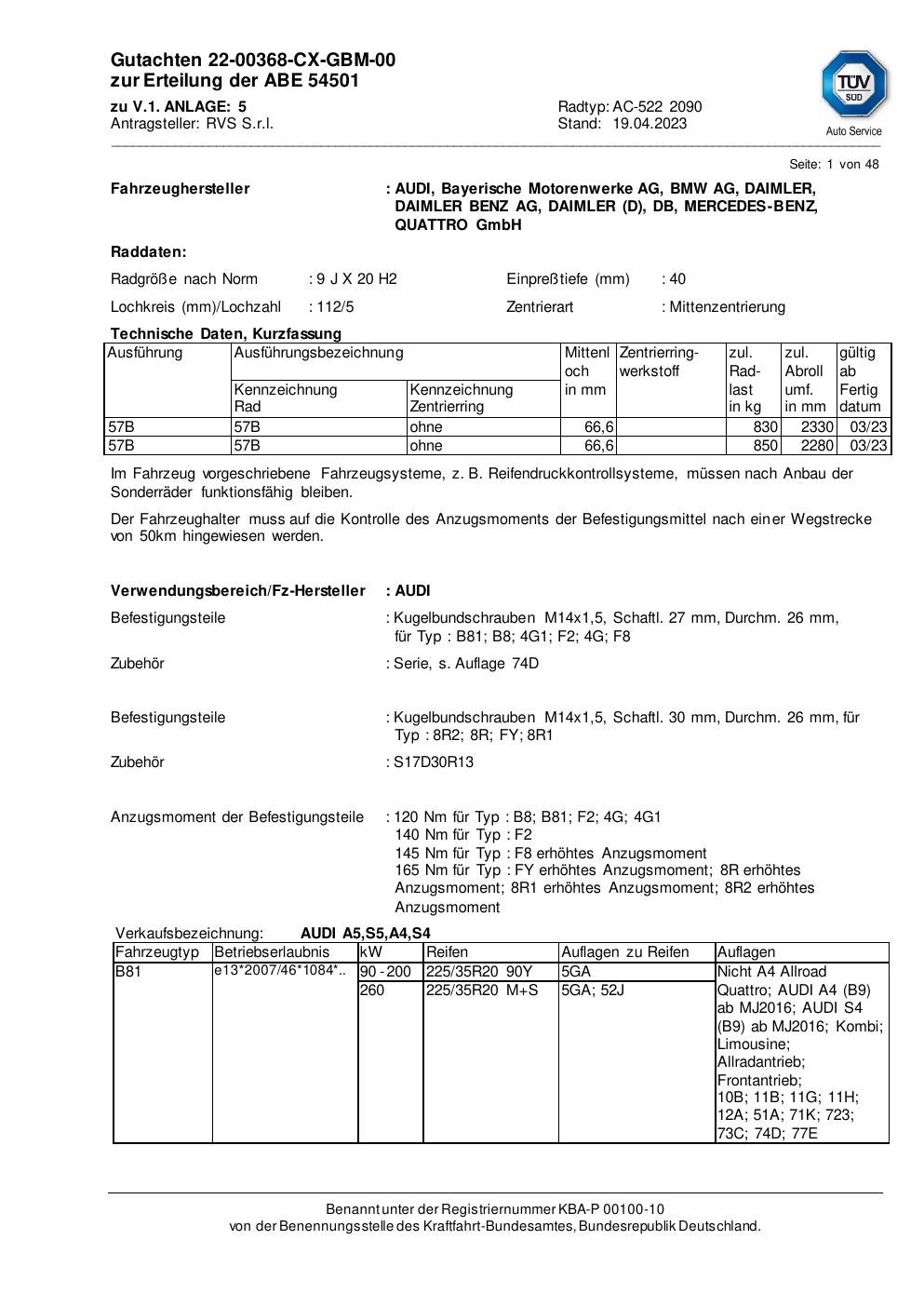 Dieses Gutachten (abe) bezieht sich auf die Alufelge RVS S.r.l. AC-522 2090 in der Ausführung ET 0, Mittenloch 0 mm (KBA 54501). Im PDF findest du typischerweise zulässige Reifengrößen, Auflagen/Anbauhinweise und – je nach Dokument – Hinweise zur Eintragung.