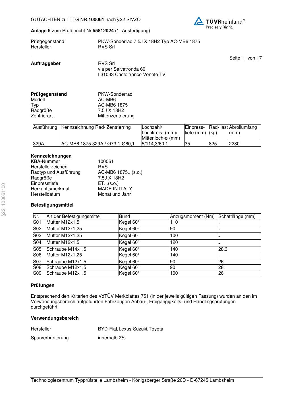 Dieses Gutachten (teilegutachten) bezieht sich auf die Alufelge RVS AC-MB6 1875 in der Ausführung ET 0, Mittenloch 0 mm . Im PDF findest du typischerweise zulässige Reifengrößen, Auflagen/Anbauhinweise und – je nach Dokument – Hinweise zur Eintragung.