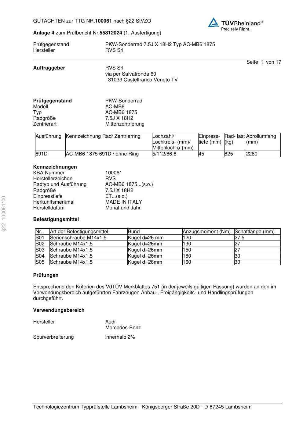 teilegutachten 100061 RVS AC-MB6 1875