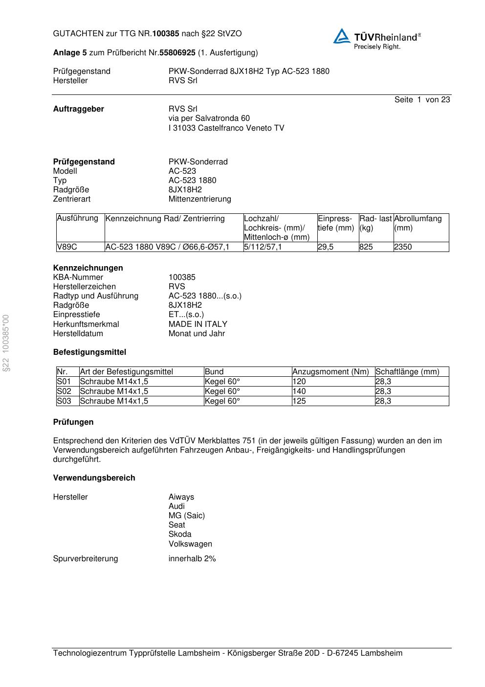 teilegutachten 100385 RVS AC-523 188 0
