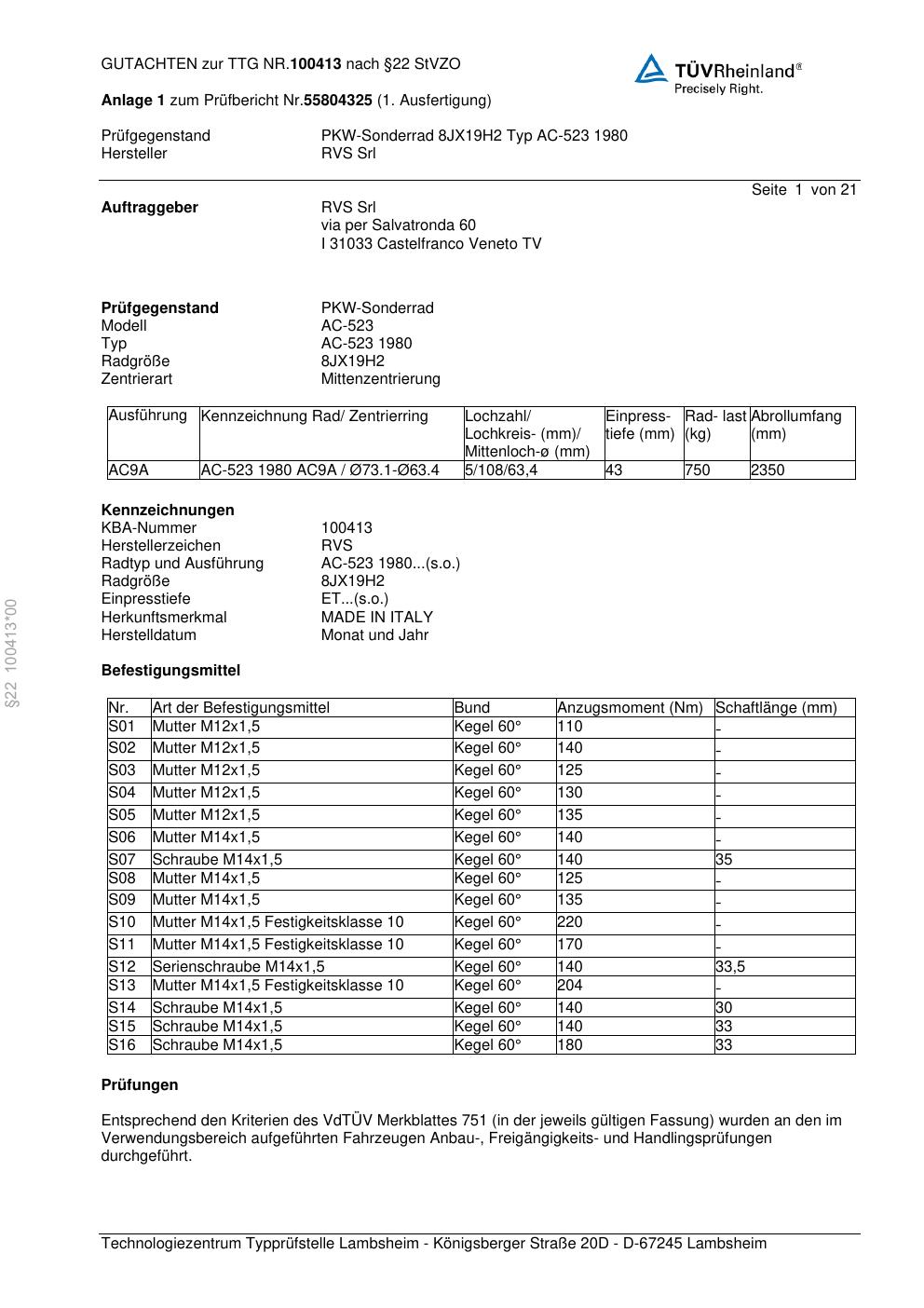 teilegutachten 100413 RVS AC-523 198 0