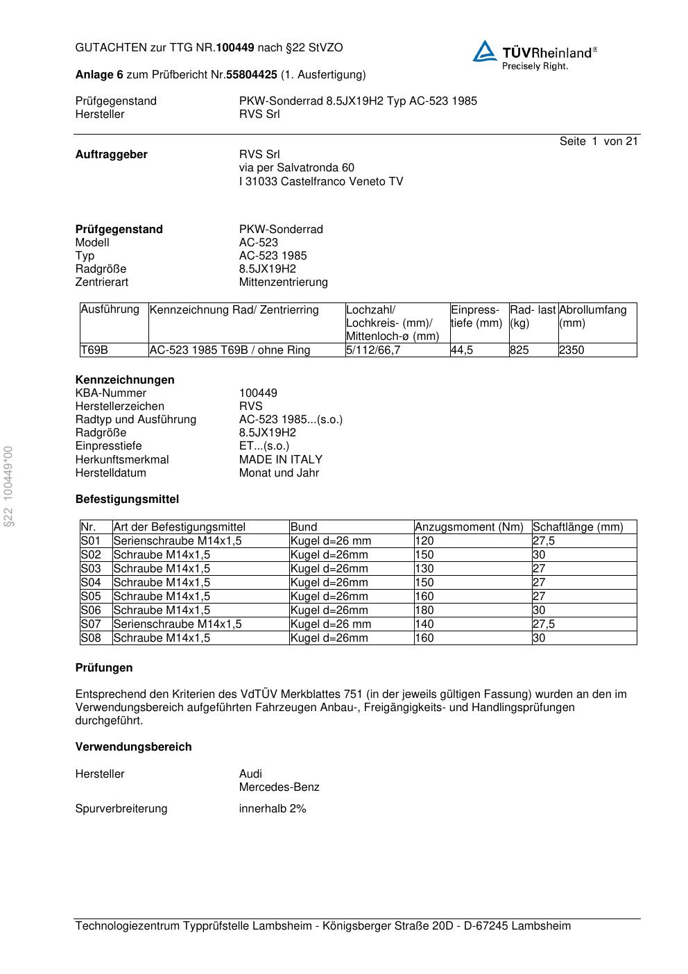 Felgengutachten / teilegutachten für Alufelgen RVS AC-523 1 985 (ET 0, Mittenloch 0 mm) (Zertifikatsnummer 100449). Hier kostenlos als PDF herunterladen. Der Download-Link ist 24 Stunden gültig und kann bis zu zwei Mal verwendet werden.