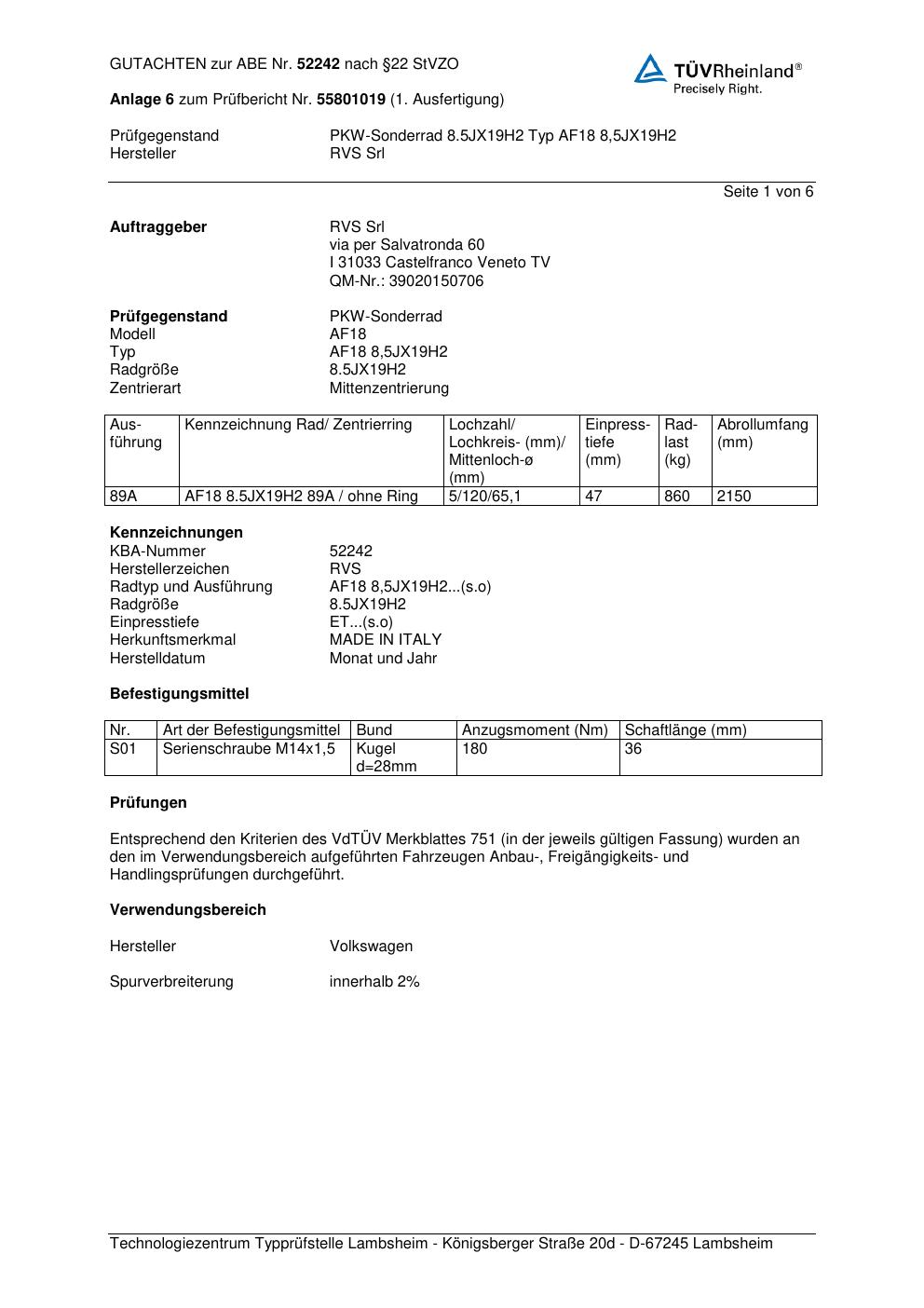 Dieses Gutachten (abe) bezieht sich auf die Alufelge RVS Srl AF18 8,5JX19H2 in der Ausführung ET 0, Mittenloch 0 mm (KBA 52242). Im PDF findest du typischerweise zulässige Reifengrößen, Auflagen/Anbauhinweise und – je nach Dokument – Hinweise zur Eintragung.