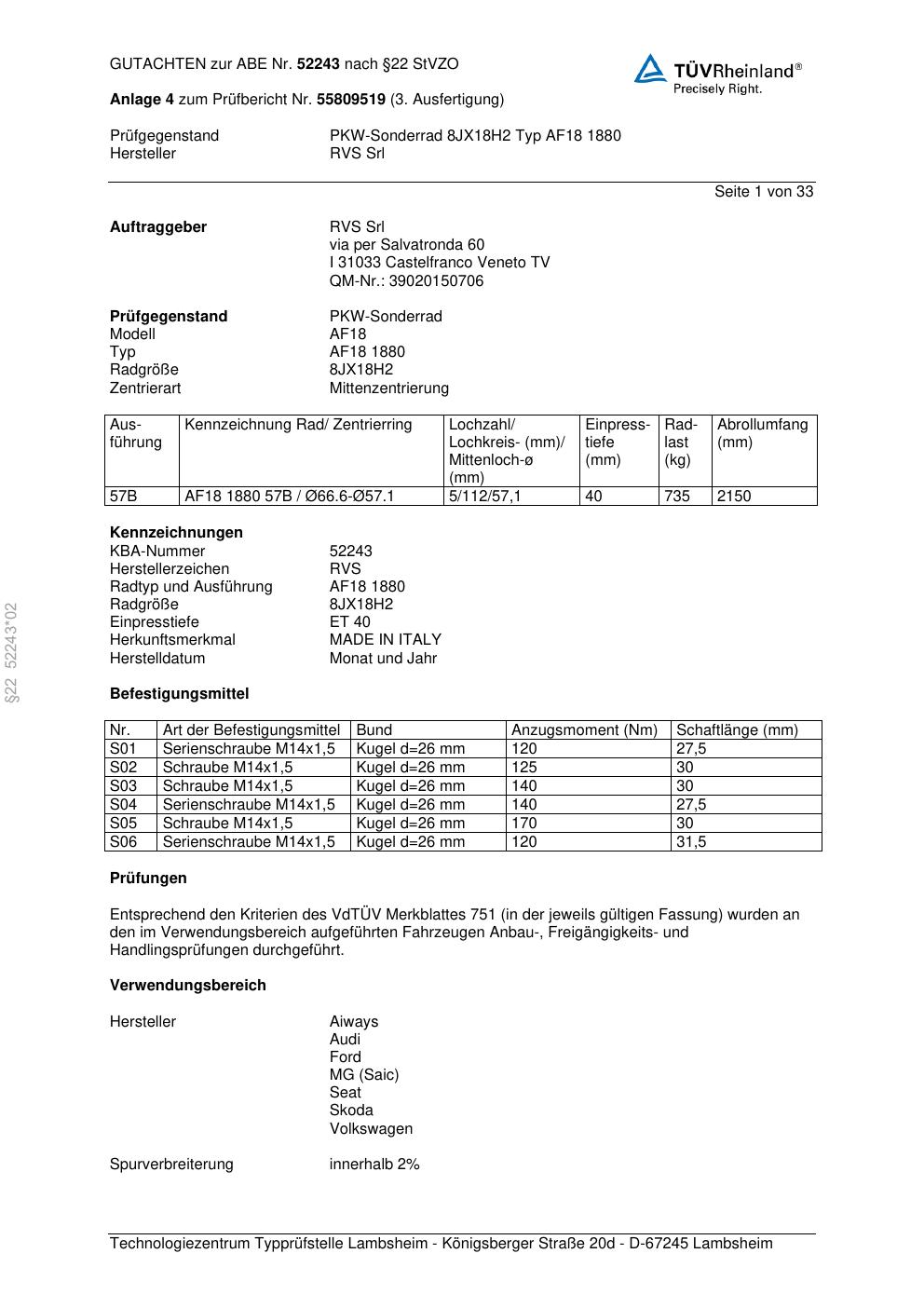 Felgengutachten / abe für Alufelgen RVS Srl AF18 1880 (ET 0, Mittenloch 0 mm) mit KBA 52243 (Zertifikatsnummer 52243). Hier kostenlos als PDF herunterladen. Der Download-Link ist 24 Stunden gültig und kann bis zu zwei Mal verwendet werden.